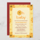 the front design shows a cute baby shower invitation in yellow and maroon typography and a " oh baby" text at the top with a flower within it. this design is cute and will be ideal for your baby shower.