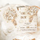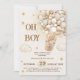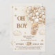 Teddy bear themed "oh boy" adorable invitation features a teddy bear soaring through fluffy beige clouds in a gold hot air balloon. Twinkling stars add magic to this design. Perfect for celebrating the arrival of a little one! Personalise with customisable fields and change the background colour. Explore matching items below. Enjoy customising and have a fantastic baby shower! Message us for design assistance.