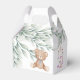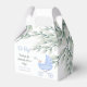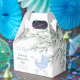 Adorable baby shower favour box to say thank you to guests for attending your baby shower! Perfect for those expecting a baby boy. Light green eucalyptus leaves surround the top all around, the front holds your personalised text and a blue baby stroller with tiny baby feet sticking out of the top. One side holds a colourful baby mobile and the back holds a cute teddy bear.