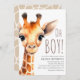 Get ready to welcome a little bundle of joy with our adorable baby shower invitation featuring a cute baby giraffe. The invitation is set against a clean white background.