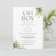 Oh boy baby shower invitation featuring elegant dusty blue typography and pretty botanical greenery foliage and your special photo on the reverse. Designed by Thisisnotme©