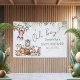 Celebrate your little boy's arrival with this adorable jungle safari baby shower banner! Featuring the phrase "Oh Boy!" in elegant script, this design highlights a charming zebra wearing a blue bow as the centerpiece, surrounded by playful watercolor animals like a giraffe, lion, and elephant. A whimsical monkey swinging on a tree branch adds extra charm to this lively jungle scene.