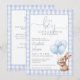 This charming baby shower invitation features a cute little bunny holding balloons and a blue gingham background. With your registry QR code and event details on the reverse. Designed by Thisisnotme©