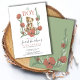 A cute rustic boy baby shower invitation featuring a watercolor teddy bear, encircled by a floral laurel of red orange flowers and green foliage. "Oh boy" theme. The reverse side of the invitation displays a larger version of the laurel on a lighter green background. Available in print, as a digital download, or both.
