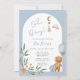 Celebrate the mum-to-be with this cute whimsical soft blue baby shower invitation featuring a watercolor illustration of vintage toys, stars and an arch with green eucalyptus leaves and stuffed animal friends with a balloon.