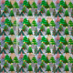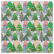 This fabric has a design of Christmas trees in various shades of green, pink, silver, and gold with different decorations.
