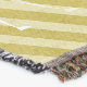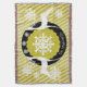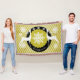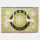 Beautiful Christmas holiday throw blanket features a background of light mustard diagonal stripes with white snowflakes, a ring of solid black with a few white snowflakes, and a centre of mustard yellow with tiny white polka dots and a big snowflake centre. Two white deer silhouettes adorn this pretty holiday throw and there's an area you can easily personalise with your family name.