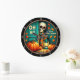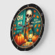 This spooky Halloween clock features a skeleton peeking out from behind a teal door, holding a lantern. Fall leaves and pumpkins are scattered around, and the text says "OH NO NOT YOU AGAIN". The clock has a black border with white numbers 1-12.