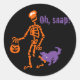 This funny design is perfect for Halloween featuring a skeleton with his jack-o-lantern trick or treat bag. He's quite distressed as a bad doggie has grabbed his leg bone to gnaw on for a Halloween treat. Text says OH, SNAP! Great to wear to Halloween parties and monster bashes. On kids and adult T-shirts, trick or treat bags, stickers, greeting cards and more! PinkInkArt original!