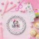 Create unique personalised paper plates for the first baby girl's birthday party in the "Oh, What Fun" theme. These plates in pink and white feature a cute girly penguin in a Santa hat and scarf, sitting with a snowman surrounded with holiday greenery and ornaments. The border is decorated with a pattern. The template makes it easy to type the birthday girl name, which is designed in a casual script font.