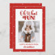 Oh What Fun Cute Script Photo Christmas Card Design features Bright colours of red and white, a fun snowy dot background, single custom photo, and trendy bouncy script font. Add your photograph image easily and customise the template with your personalised text. The perfect design for families with kids or baby!