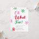 This festive holiday party invitation features modern calligraphy script that says "Oh What Fun!" in pink, red, and green with coordinating snowflakes. The invitation details are in a modern font. Customise this design further by adding a photo and/or additional text to the back. The look is fun, modern, and festive!