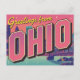 This ultra-modern, retro-style design features the iconic "Greetings from OHIO" typography in bold pink and purple hues. The backdrop is a vibrant, mid-century-inspired cityscape and bridge over water, reflecting a major urban center like Cleveland, Columbus, or Cincinnati. The unique color palette gives this vintage travel art a distinct Pop Art aesthetic. Perfect for fans of bold, colorful designs, urban landscapes, and the Buckeye State.