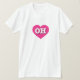 This shirt features a vibrant hot pink heart containing the bold, white, upper case letters OH, the official abbreviation for Ohio, the buckeye state.