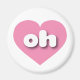 This magnet features a calm, cool pink heart containing the bold, white, rounded, lower case letters oh, a playful abbreviation for Ohio, the buckeye state.