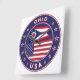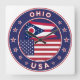 Badge of Ohio with flag of Ohio and flag of USA colours, rounded shape.