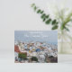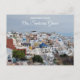 Postcard of Santorini, Greece showing the town of Oia. This photographic image captures the town perch on the side of the island with the sea behind. Santorini is one of the most popular Greek islands and having visited it is not hard to see why. There are two idyllic towns the capital Fira, with it's famous church with three bells, though I noticed that a lot of the churches on Santorini have three bells, and the town of Oia where people gather to see the spectacular sunset everyday. They both have lots of white washed buildings and narrow streets as well as blue dome churches. Santorini is a very popular Greek island for couples that want to get married in the sun. If however you want a beach then you would have to come away from Fira and Oia, as pretty as they are, they do not have beaches. Santorini, Greece postcard