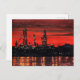 In this industrial watercolor seascape, the sky is awash in red after a brilliant sunset in Portland, Maine. Oil derricks under construction create stark silhouettes against the brilliant reds and oranges. Pinpoints of light blaze, reflecting in the ocean water as work continues into the night.