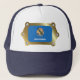 The design printed on this hat features the Oklahoman flag surrounded by a metallic looking frame.