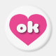 This magnet features a vibrant hot pink heart containing the bold, rounded, white lower case letters ok, a playful version of the abbreviation for Oklahoma, the sooner state.