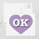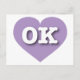 This postcard features a mellow, lavender heart containing the bold, white upper case letters OK, the official abbreviation for Oklahoma, the sooner state. The reverse side of the postcard is blank, awaiting your handwritten sentiments or personalised text. Choose font style, size, and colour.