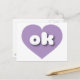 This postcard features a shapely and cool lavender heart containing the bold, white, rounded lower case letters ok, a playful abbreviation for Oklahoma, the sooner state. The reverse side of the postcard is blank, awaiting your customised text or handwritten sentiments.