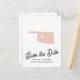 Modern OKLAHOMA State Destination wedding save the date with OKLAHOMA State silhouette in blush pink with with heart, save the date in a contemporary font and your name and wedding date along the bottom. On the back a space for a custom message and your return address.