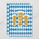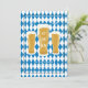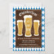 Oktoberfest (Octoberfest) festival party white typography blue Bavarian flag , celebrate the traditional German Bavarian beer festival. A modern mixed with rustic brown wood invitation with white Oktoberfest typography on blue diamond pattern Bavarian flag with illustration pints of beers and rustic typography.
