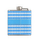 Oktoberfest themed drinking flask done in the classic blue and white diamond pattern for Oktoberfest, with graphics of a blue satin looking ribbon across the middle. Graphics of a single white edelweiss bloom, decorates the middle front of the flask. Personalise the custom black text, on the front, for yourself or as a charming gift idea for her.