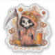 Cute Grim Reaper ready for Oktoberfest with a mug of beer, pretzels and pumpkins. The text reads, "Last call for the afterlife."