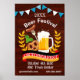Invitation for Oktoberfest beer festival with a beer mug, pretzel, sausage, a ribbon banner with the German flag colours, Bavarian flags on the top to celebrate Oktoberfest in the fall.