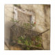 Old stone building with a rustic balcony containing overgrown plants and flowers. Desolate and abandoned from many years ago, nature still persists.