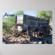 This picturesque, old wooden wagon sits outside a shop in Sedona, Arizona. It's just a big, gray, box with extra wooden wheels propped against it. Green trees alternate with blue sky in the background, and small boulders ring the foreground. I don't know if you can feel the dusty, hot day as it was when I took this picture, but I can still feel its heat! Photo copyright Gail Storrs, 2012.