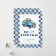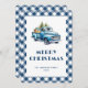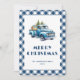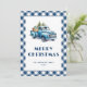 Blue gingham plaid holiday card featuring a blue old truck carrying Christmas trees and presents.