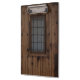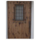 Old knotty brown oak mediaeval Spanish door with a centre window covered with black wrought iron bars.