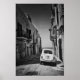 Photo poster of an old Renault 4 car in a small street towards the sea in a small southern italian town, Polignano a Mare in Apulia, Italy in black and white.