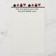 This humourous stationery is for all card players. It would make a great inexpensive small gift or stocking stuffer for poker players, bridge , canasta or solitaire players. At the top is a row of card symbols; black spades, red diamonds, black clubs and red hearts. The text says "Old card players never die; they just shuffle away."  You can change the text and/or the background colour if you want. See other small gifts in my "Small gifts and Stocking Stuffers" collection.