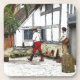 Two Tudor farmers enjoying some quality time, one off in search of ale and the other playing a drum. England UK. Watercolor.
