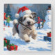 A fluffy Old English Sheepdog runs happily through the snow, wearing a bright red Christmas hat. The playful winter scene showcases the breed’s shaggy coat, gentle nature, and joyful spirit while capturing the festive magic of the holiday season. A charming design full of warmth and cheer.
