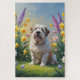 A cheerful dog sits peacefully on lush green grass, surrounded by colourful spring blooms under a soft blue sky. This digital oil painting captures a serene moment with expressive brushstrokes, warm colours, and a sense of gentle joy.