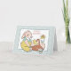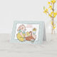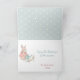 On the front of this pretty Easter card is an old fashioned Easter bunny dressed in teal green and yellow, and sitting next to a basket. Inside the basket is a little yellow chick. The text above says "Happy Easter" in soft pink. A pattern frame surrounds the image and text. Inside there are more customizable text fields in pink and pastel teal green. There's another image of the bunny with a watering can at the bottom.