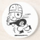 Black and white cartoon of a football player running with the ball, hand out, ready to block. He's wearing an old fashioned leather football helmet. Great for the football parties