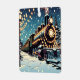 An old-fashioned train decorated in illuminated Christmas lights travelling down a snowy track on a winter's night.