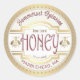 Old-fashioned label design flanked with stylised gold honeybees. Gold Border. Personalise with your apiary business name at the top and add in your location and honey net weight below.
