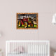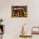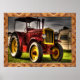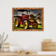 This vintage tractor has a old brown steal cover on it. With old yellow metal rims.The body id red and the front grill is yellow.You can see the grey clouds and green grass.This poster has a wood floor frame.