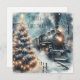 Personalised Christmas card. . Old-fashioned vintage retro train in a beautiful snowy winter scene with a pine tree with illuminated Christmas lights.