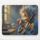 Old lady with messy grey hair drinking coffee by a sunlit window