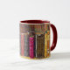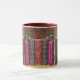 Old Leather-Bound Books Mug - Step into a world of classic literature and timeless knowledge with our Old Leather-Bound Books Mug. This unique mug features a beautifully crafted design of old leather-bound books, complete with ornate details, colourful faux embroidery texture and a vintage feel. The colourful and decorative pattern is reminiscent of a classic library or bookshelf, evoking a sense of nostalgia and love for reading. Shown with maroon handle and interior, but you can choose a different colour if desired.