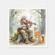 An elderly man peacefully plays the fiddle for a fawn and squirrels while sitting on a moss-covered tree stump in a serene forest