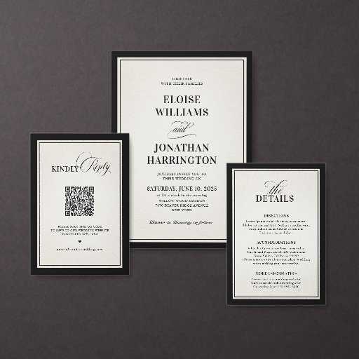 This old money inspired black and ivory square wedding details card blends timeless typography with modern convenience. The refined serif layout and elegant script heading are framed by a bold black border, creating a sophisticated black tie aesthetic.